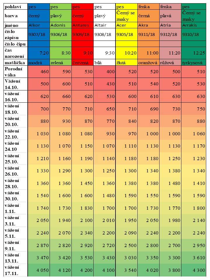 Váhovou tabulku a fotečky štěňátek najdete na stránce vrhu A a více pak na FB stránkách a skupině z Milkova dvora.