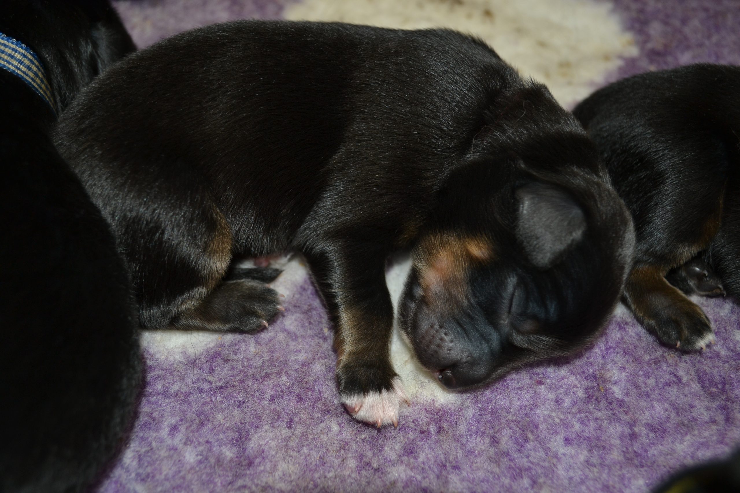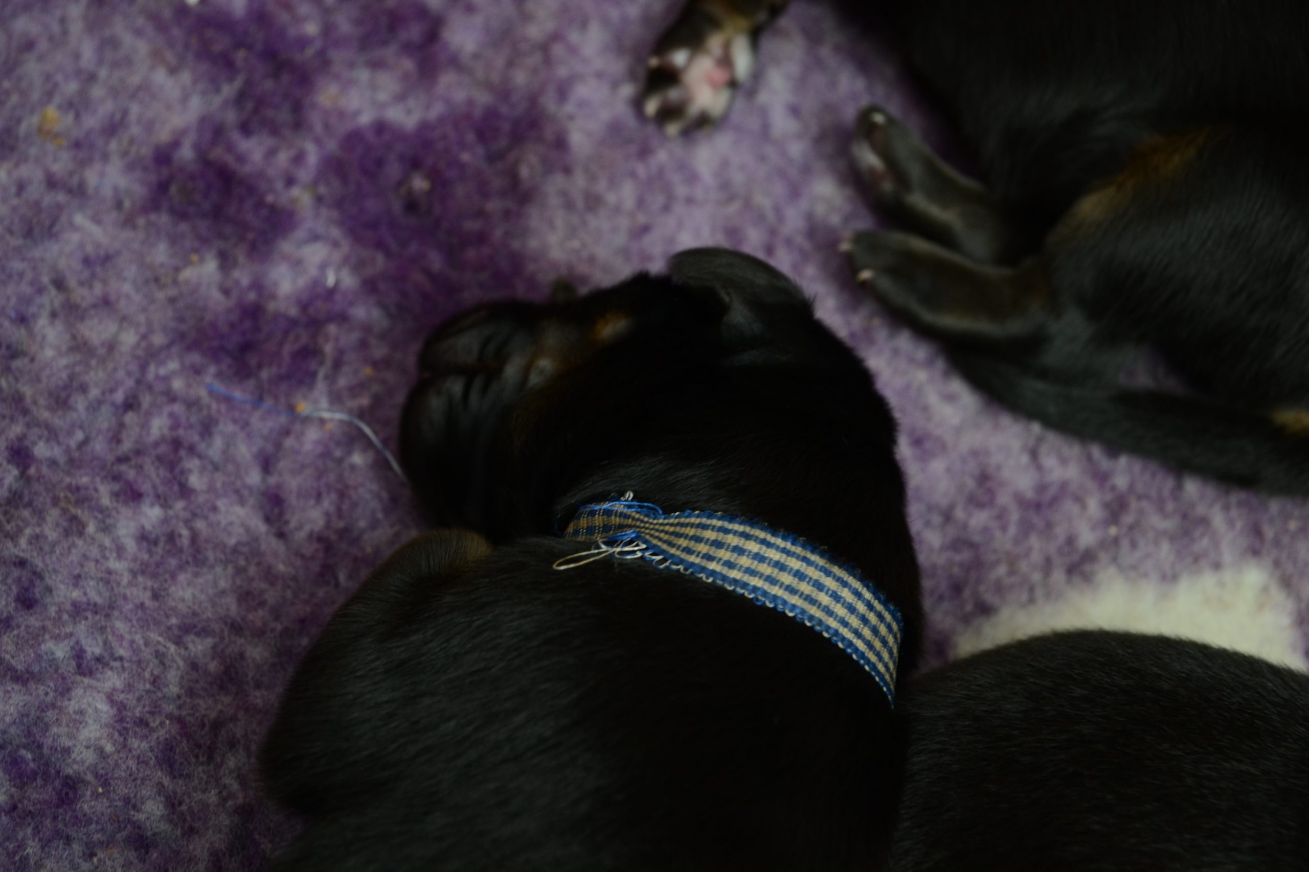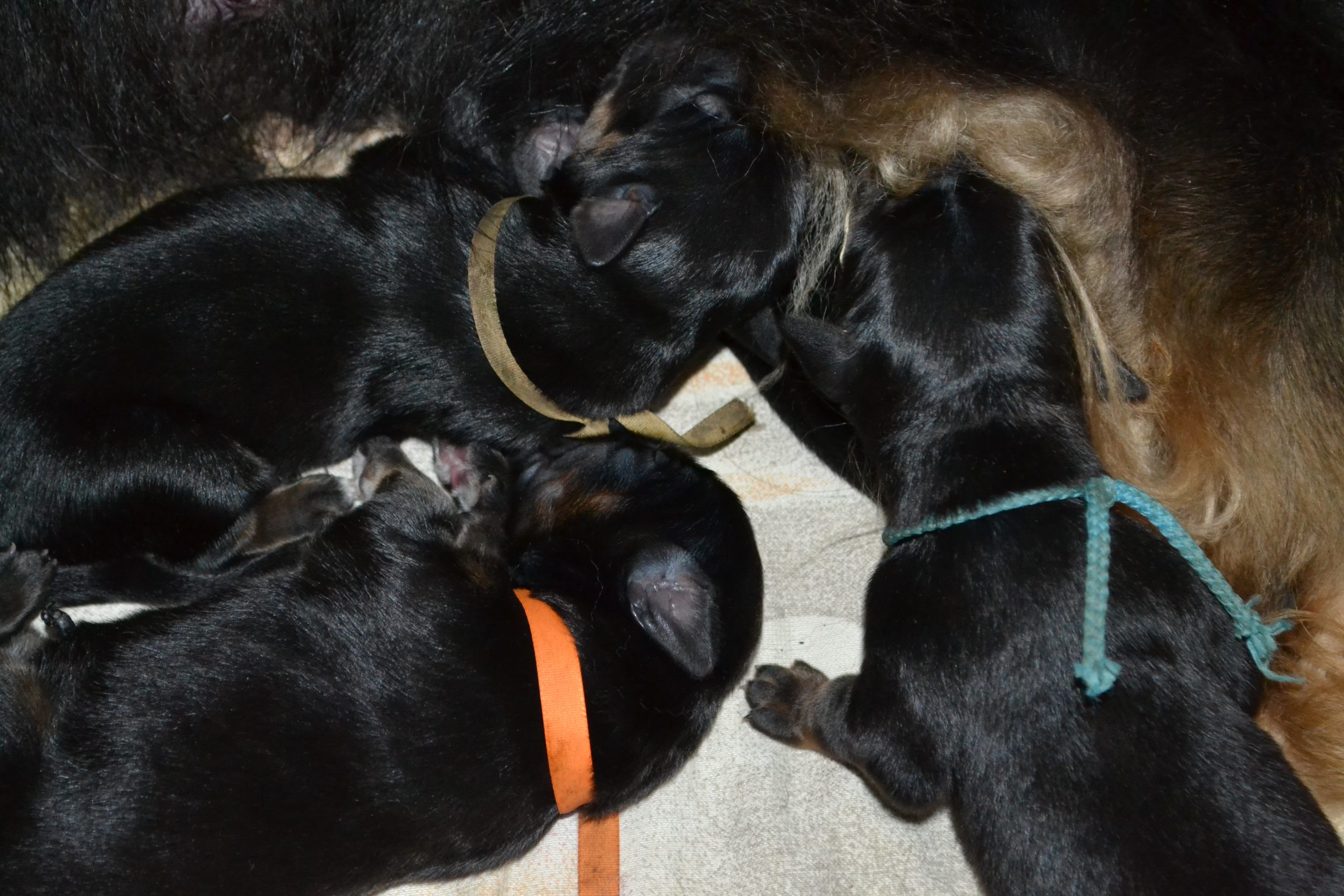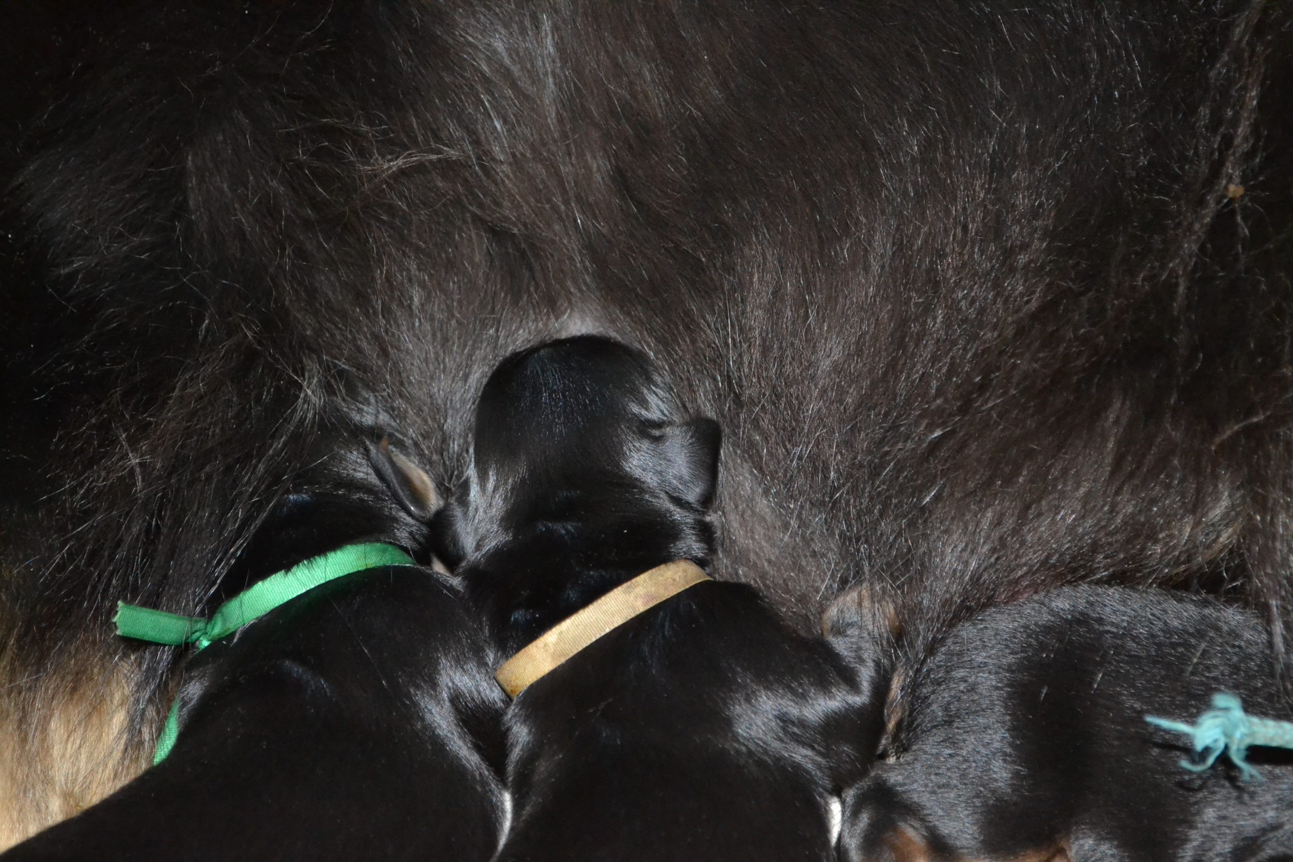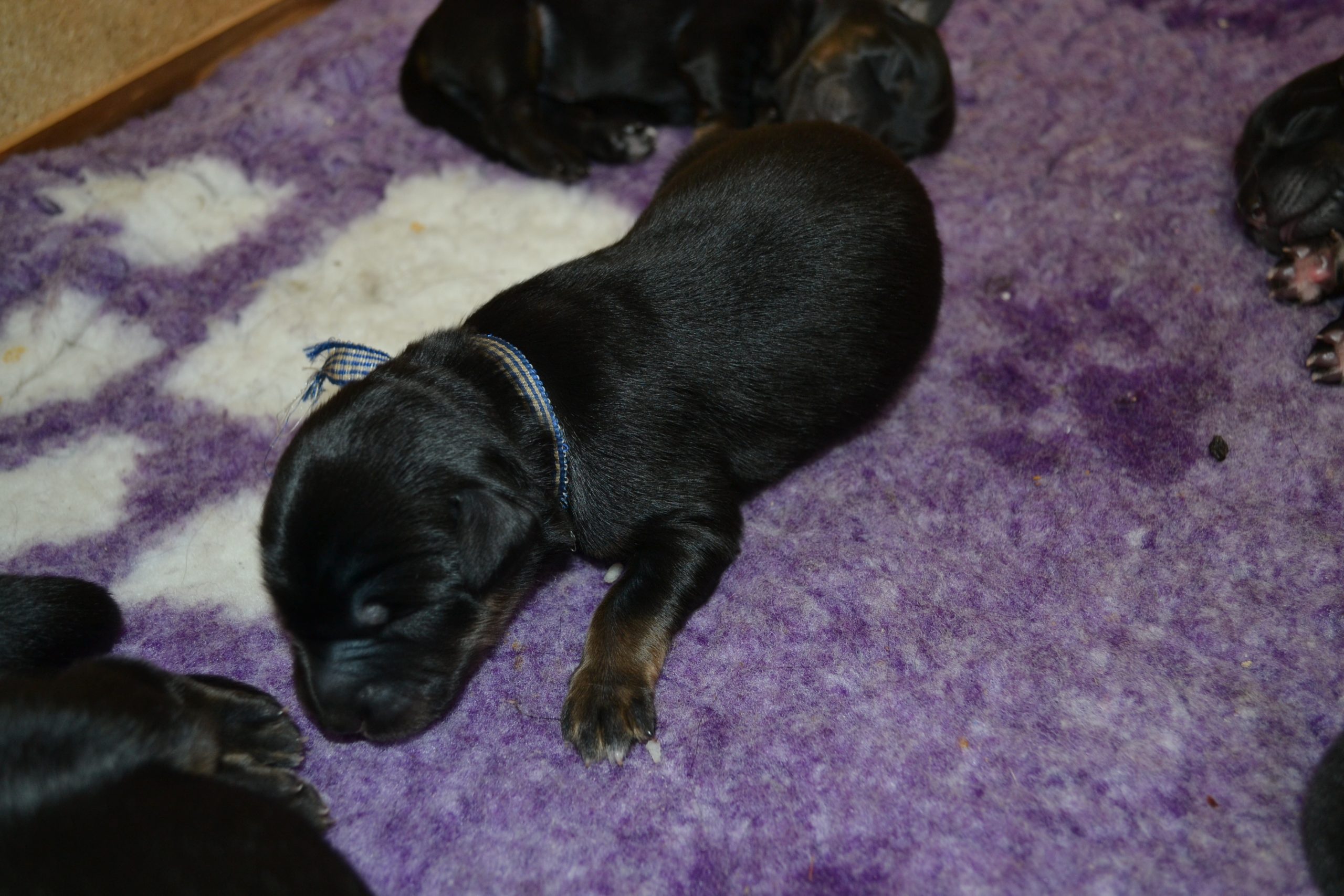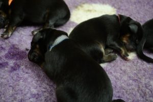 Naše štěňátka z vrhu B za sebou mají již 2 dny života. Pilně se krmí a spinkají, aby nám vždy večer mohla říct o kolik zase vyrostla. Včera to bylo kolem 40g, dneska již kolem 60g. Všechna štěňátka vrhu B tak pokořila hranici půl kila.